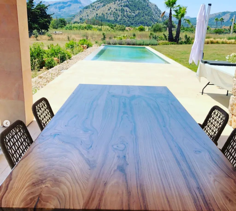 En aquesta vivenda es va realizar tota la fusteria interior i exterior. Però, cal destacar la zona de la piscina on s'hi va projectar una fantàstica cuina exterior i una taula totalment fet a mida. Es va mantenir una línea rústica que acompanyava a la perfecció l'entorn i es va obtenir un resultat molt confortable i equipat. Tot el mobiliari de la cuina també es va fabricar a mida. Les portes de la cuina duen un sistema de tiradors ocults / integrats a fi de donar-li un aire més actual ja que l'estètica general era de caire rústic i així s'aconseguí un resultat més minimalista.